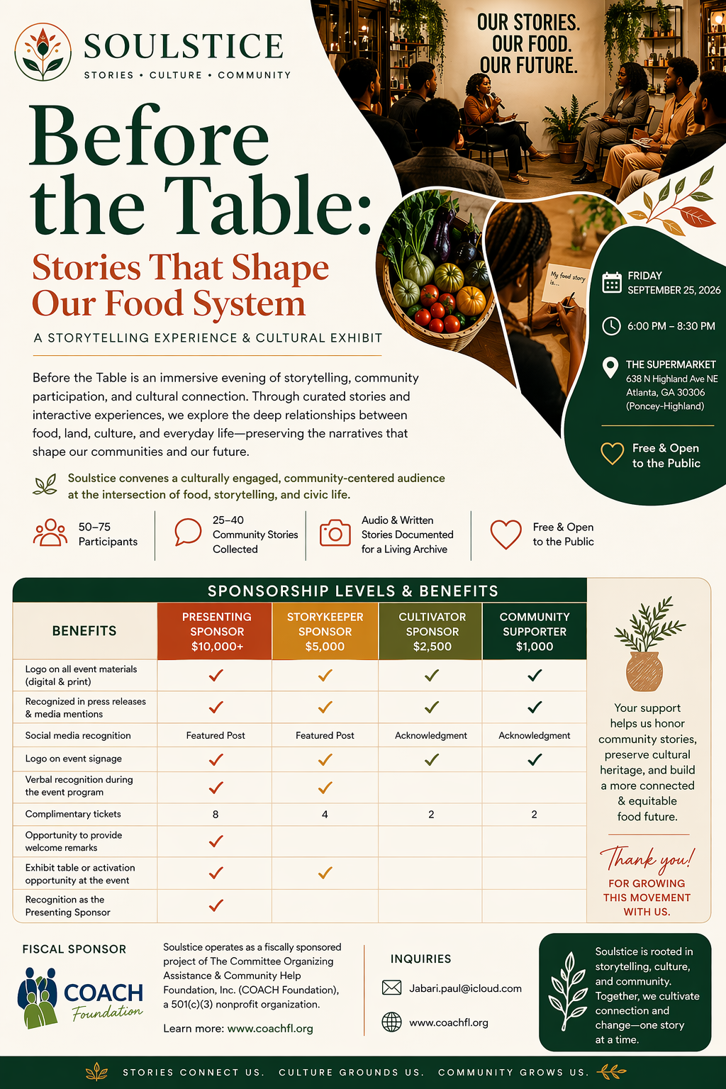 The COACH Foundation proudly serves as the fiscal sponsor for Soulstice, supporting its mission to create culturally grounded experiences that connect food, storytelling, and community.